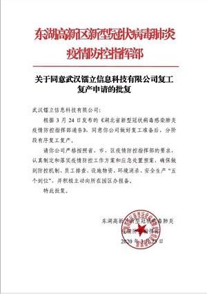 2020年3月25日,東湖高新區(qū)疫情防控指揮部發(fā)出了關(guān)于同意武漢鐳立信息科技有限公司復(fù)工復(fù)產(chǎn)的批復(fù)通知,我們終于可以回到熟悉的辦公室。