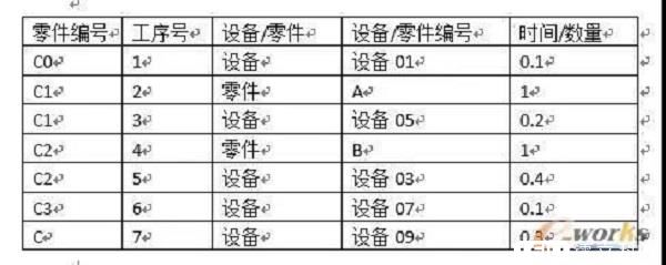 例如C1工序既涉及到加工,又涉及到組裝。如果該工序號后面寫的是零件,則該步驟為裝配,后面是裝配使用的數(shù)量。如果工序號后面是設(shè)備,則后面是具體設(shè)備編號,和在該設(shè)備上加工使用的時間。通過該表就可以表示出流程中既有裝配,又有組裝的復(fù)雜流程。