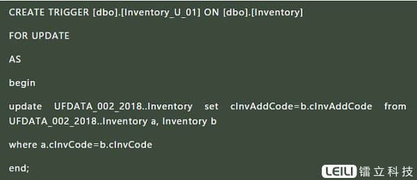 例如,我們需要利用觸發(fā)器更新UFDATA_002_2018..Inventory數(shù)據(jù)表,可以利用下面代碼創(chuàng)建觸發(fā)器,因為數(shù)據(jù)表實際字段很多,本文只選cInvAddCode一個字段做代碼展示,更改其它字段道理相同。