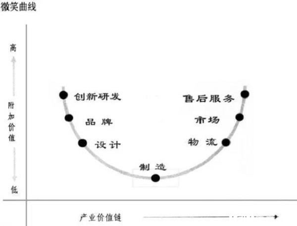 微笑曲線表明價值最豐厚的區(qū)域集中在價值鏈的兩端,即研發(fā)和市場銷售,中間的制造產(chǎn)生的附加值最低。所以在打通研發(fā)與銷售的環(huán)節(jié)下,降低制造費用,提高制造效率尤為重要。