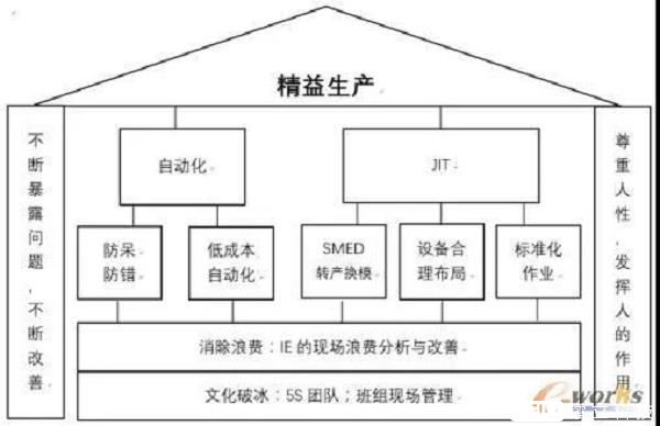 豐田式生產(chǎn)方式被稱之為TPS,1985年麻省理工學(xué)院為TPS冠上了名號Lean Production,即“精益生產(chǎn)”。精益生產(chǎn)以準(zhǔn)時化生產(chǎn)(JIT),和自働化為兩大支柱,致力于保證產(chǎn)品質(zhì)量的前提下,消除生產(chǎn)浪費,提高生產(chǎn)效率,降低生產(chǎn)成本。