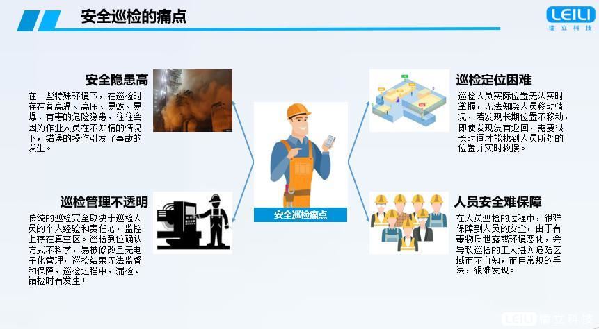 安全生產,不能止于一句口號,武漢鐳立智能巡檢系統(tǒng)在為生產企業(yè)提供基本的生產點檢、質量巡檢、設備點檢、維修、保養(yǎng)管理的同時,也為企業(yè)打造了基于面向現場人員的安全監(jiān)管系統(tǒng),建立一整套完備的具有智能監(jiān)控管理、報警、現場人員的實時定位、追蹤等功能的人員定位系統(tǒng),為企業(yè)及員工的工作安全性和管理效率保駕護航,降低安全隱患、減少安全事故的發(fā)生。同時可與現有生產系統(tǒng)有效集成并進行多方面功能擴展,完善整體監(jiān)控管理系統(tǒng)的功能,有效增強系統(tǒng)的安全性,真正意義上實現現場工作人員的實時安全監(jiān)控,對于企業(yè)實現智能化、信息化管理意義深遠。