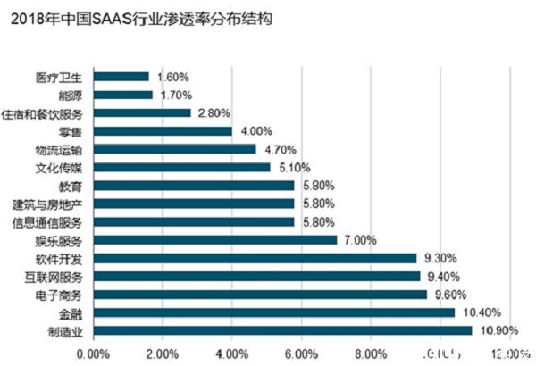 談到云主要包含三種服務(wù)形式:基礎(chǔ)設(shè)施即服務(wù)(IaaS)、平臺(tái)即服務(wù)(PaaS)和軟件即服務(wù)(SaaS)。大家談的最多是SaaS,從2013年開(kāi)始,中國(guó)就開(kāi)啟了SaaS企業(yè)服務(wù)元年,也隨著這幾年產(chǎn)業(yè)互聯(lián)網(wǎng)的概念興起,越來(lái)越多的之前服務(wù)于C端的企業(yè),轉(zhuǎn)型到面向B端,都想通過(guò)SaaS的方式成為第二個(gè)salesforce ,也讓SaaS無(wú)論是在資本市場(chǎng)還是軟件同行中,都是一個(gè)炙手可熱話題。甚至連IT巨頭如SAP、Orcale以及國(guó)內(nèi)金蝶用友都紛紛的推出SaaS軟件產(chǎn)品,據(jù)2018年銳觀網(wǎng)發(fā)布的數(shù)據(jù)統(tǒng)計(jì),SaaS在制造業(yè)中的滲透率占比為10.90%居首位: