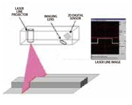 檢測原理:利用結(jié)構(gòu)光掃描方法,通過結(jié)構(gòu)光及其在相機上的成像可以通過三角關(guān)系計算出表面物體的高度。